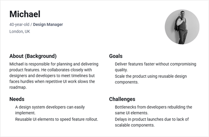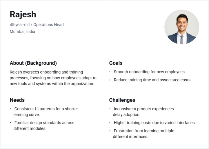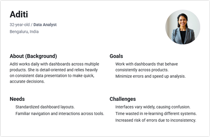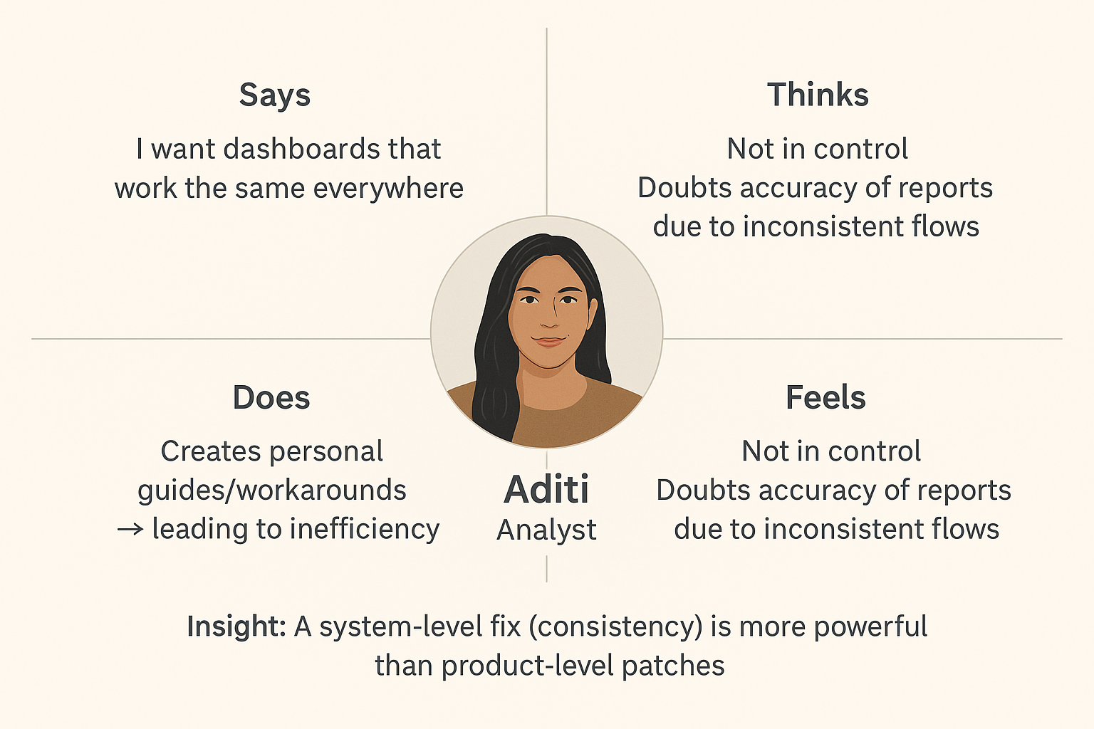 To uncover deeper behavioral patterns, we mapped Aditi’s experiences across what she feels, thinks, says, and does in her day-to-day work. This exercise highlighted the emotional and practical friction caused by inconsistent product flows, shaping critical insights for the design system strategy.